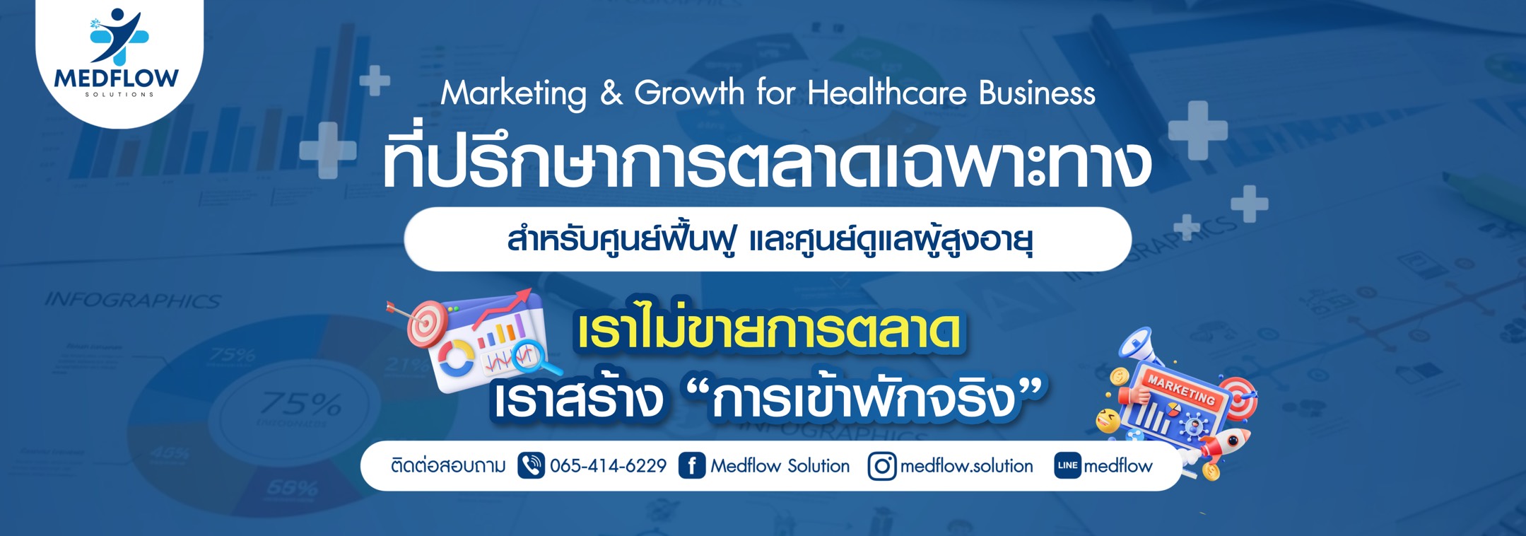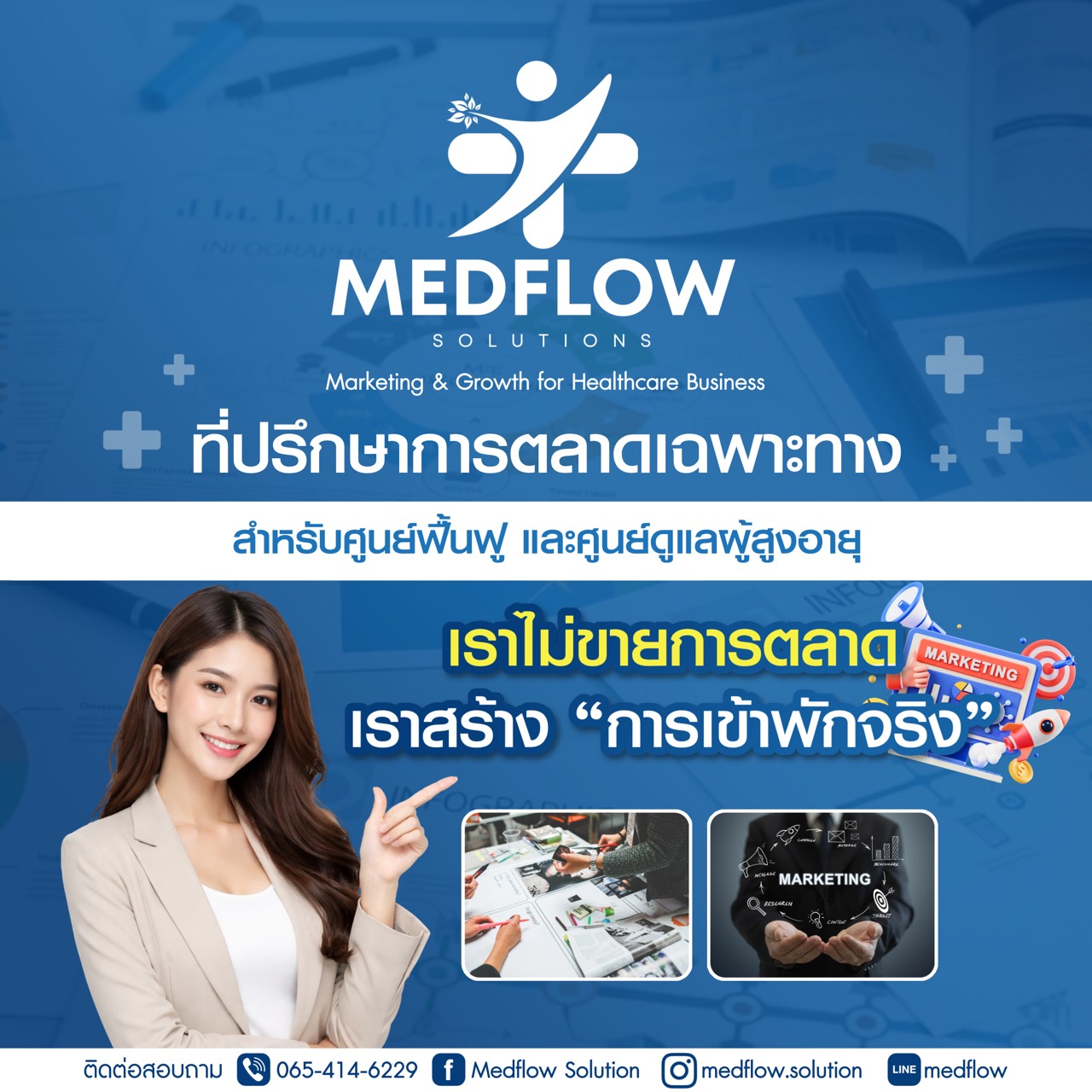 คือที่ปรึกษาการตลาดเฉพาะทาง สำหรับศูนย์ฟื้นฟูและศูนย์ดูแลผู้สูงอายุ เราไม่ได้เริ่มจากการยิงโฆษณาแต่เริ่มจากการเข้าใจ การตัดสินใจของครอบครัวผู้ป่วย ตั้งแต่ความกังวล ความลังเล ไปจนถึงความเชื่อมั่นก่อนเข้าพัก ด้วยประสบการณ์ทำงานจริงในศูนย์ MEDFLOW จึงออกแบบระบบการตลาดและการปิดการขาย ที่สอดคล้องกับหน้างานจริง ถูกต้องตามกฎหมาย และวัดผลที่ “การเข้าพักจริง” ไม่ใช่แค่ตัวเลขบนหน้าจอ